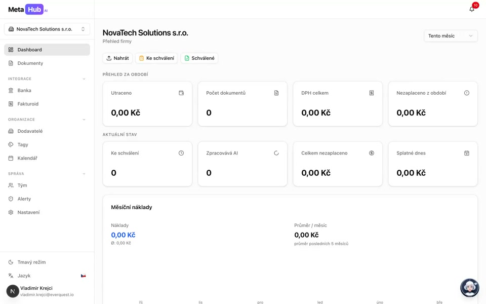 Dashboard, cashflow, schvalování a AI analýza výdajů — MetaHub je operační systém vaší firmy. Vy se soustředíte na byznys, my se staráme o přehled.